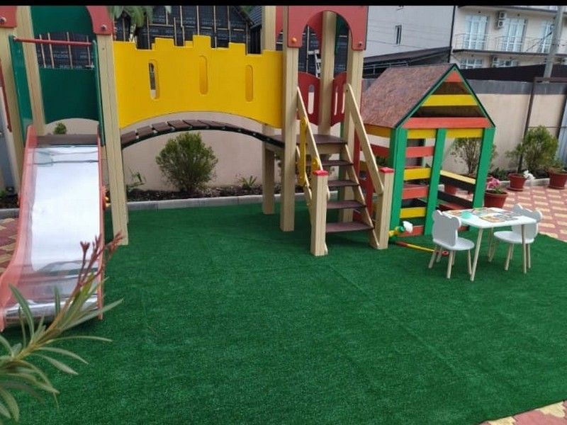 Территория: просторная и благоустроенная, большой бассейн с подогревом с детской зоной, лежаки, зона отдыха, мангальная зона и детская игровая площадка с горкой.